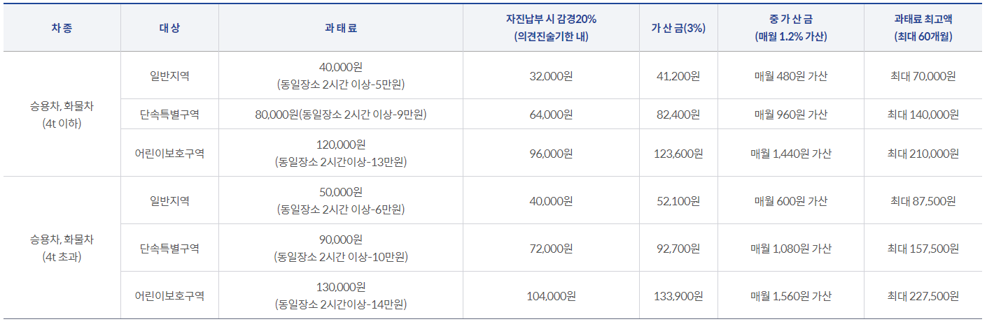 주정차 위반 과태료는 4 ton을 기준으로 차종 구분이 되고 일반지역과 단속특별구역, 어린이 보호 구역에 따라 나뉘어 과태료가 측정됩니다.