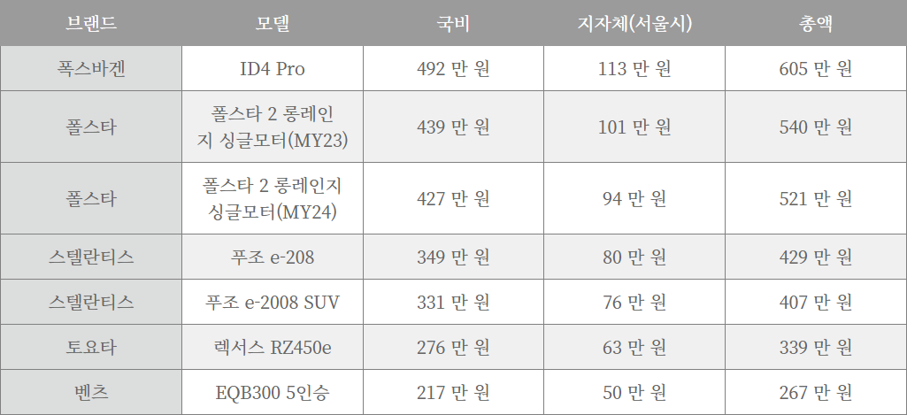 2024년 전기차 국비 보조금은 지난 글에서 설명드린 것처럼 수입차 부분에서는 ID4가 492만 원으로 가장 많은 지원금을 받게 되었습니다.